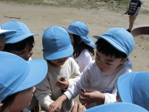 皆さんご存知かと思いますが、イースターはイエスさまの復活をお祝いするキリスト教のお祝い事で、日本語では「復活祭」とも呼ばれています。キリスト教会では、4月9日にお祝いされましたが、新年度が始まったばかりで、子どもたちも落ち着いていない時期のため、こども園では今日「イースター礼拝」を守りました。昨日の森のものがたりに書きましたが、3〜5歳児は、中高へ続く階段を上り、礼拝堂へ向かいましたが、園を出てすぐの坂を上ったところにある横断歩道では、一旦停止し、左右を確かめてから渡ることを先生たちがしっかりと伝える様子がありました。学内に横断歩道があることに驚くとともに、車がくることのない安全な時間帯でもしっかりと交通ルールを伝えている姿から生活の中にしっかりと学びがあること、5歳児が3歳児と手を繋ぎ堂へ歩いてくれる姿に良き交流がなされていること、礼拝堂前の池で鴨が気持ちよさそうに泳ぐ様子に贅沢な環境を再認識させました。礼拝堂では普段なかなか聞くことができないパイプオルガンの厳かな音色に触れ、色鮮やかなステンドグラスに圧倒された子どもたちもいたかと思いますが、中高の宗教主事のO先生がひよこが飛び出す可愛らしい小道具!?を使い楽しく伝えてくださったイースターのお話に耳を傾け、讃美し、祈り園に戻ってくることができました。子どもたちは一人ひとりクラスで渡してもらったイースターエッグとカードを持ち帰ります。ぜひ、ご覧になってみてください。さて、今週も、ブロイラーのように定時に提供してもらうお菓子や給食を検食する以外何をしていただろうか?という具合にあっという間に一週間が過ぎてしまいました。その間、草木が葉をどんどん茂らせ、鳥が鳴き、虫たちが活発に活動する様子に、確実に季節が進んでいることを実感します。そんな中、午後一時頃、田んぼの先生であるKさんが先日蒔いたお米の育ち具合を北の園庭に見に来てくださり「順調に育っています。来週月曜日には〜」とお墨付きをくださり、担任に次なる取り組みを伝えてお帰りになりました。一方、時を同じにして、南の園庭では4歳児そら組の子どもたちがカナヘビを捕まえて「僕も・私も触ってみた〜い」「見せて〜」と大騒ぎ・大喜びしていました。生き物好きの子どもたちにとっては待ちに待った季節の到来ですが、生き物たちにとっては受難の季節となるのでしょう。梅雨入り前の清々しいこの季節、子どもたちと一緒に思い切り自然満喫したいものです。