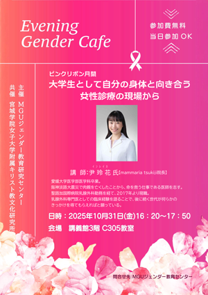 今回は「イブニング・ジェンダーカフェ」と題して実施しました。ピンクリボン月間にあわせ、乳腺外科専門医の尹玲花氏をお招きし、女性診療の現場から見える「大学生として自分の身体と向き合うこと」についてお話しいただきました。医療の最前線での日々の経験から、若い世代が知っておきたい身体のこと、健康との向き合い方についてわかりやすく語っていただく機会となりました。