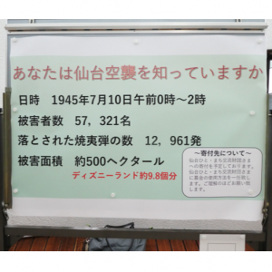 私たち友野班では、今まで募金活動をテーマに研究を行っていました。また、今年は戦後80年の節目の年であることから、戦争に関する募金活動を大学祭にて行いました。私たちの班では、仙台空襲を主題に掲げて研究をしました。また、実際に募金活動をしてみて、募金に協力していただくためには、具体的な目的をしっかりと伝えることや積極的な声がけをすることが大切だということを学びました。